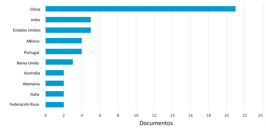 En la figura 2 se muestra el análisis de la producción científica por país en donde se revela que China lidera con un número significativo de documentos (23), seguida por India y Estados Unidos, con contribuciones moderadas. Países como México, Portugal y Reino Unido también muestran una producción notable, aunque menor en comparación con los líderes. Otros países como Australia, Alemania, Italia y la Federación Rusa presentan una menor pero relevante participación.