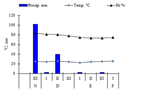 Los datos climáticos correspondientes al período que duró la investigación fueron tomados decenalmente en el Centro Meteorológico de la provincia Granma. Temperaturas medias que oscilaron entre 24,2 y 25,3 ºC, humedad relativa entre 74,2 y 82,6 % y lluvias acumuladas durante el periodo de 180 mm. (Fig. 1)