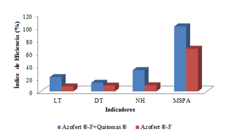Los índices de eficiencia para los indicadores longitud de tallo (LT), diámetro de tallo (DT), número de hojas (NH) y masa seca de la parte aérea (MSPA) (Fig. 4), muestran los incrementos obtenidos al aplicar los tratamientos con bioproductos respecto al tratamiento control sin aplicación.